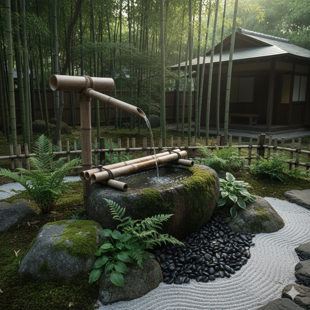 - Bamboo and rustic Zen water features