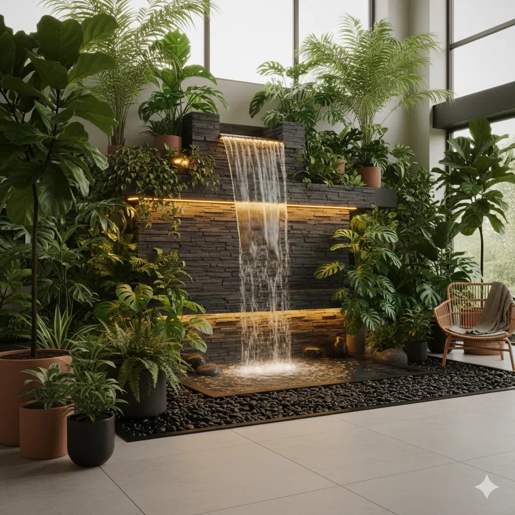 - Indoor garden waterfalls surrounded by lush greenery