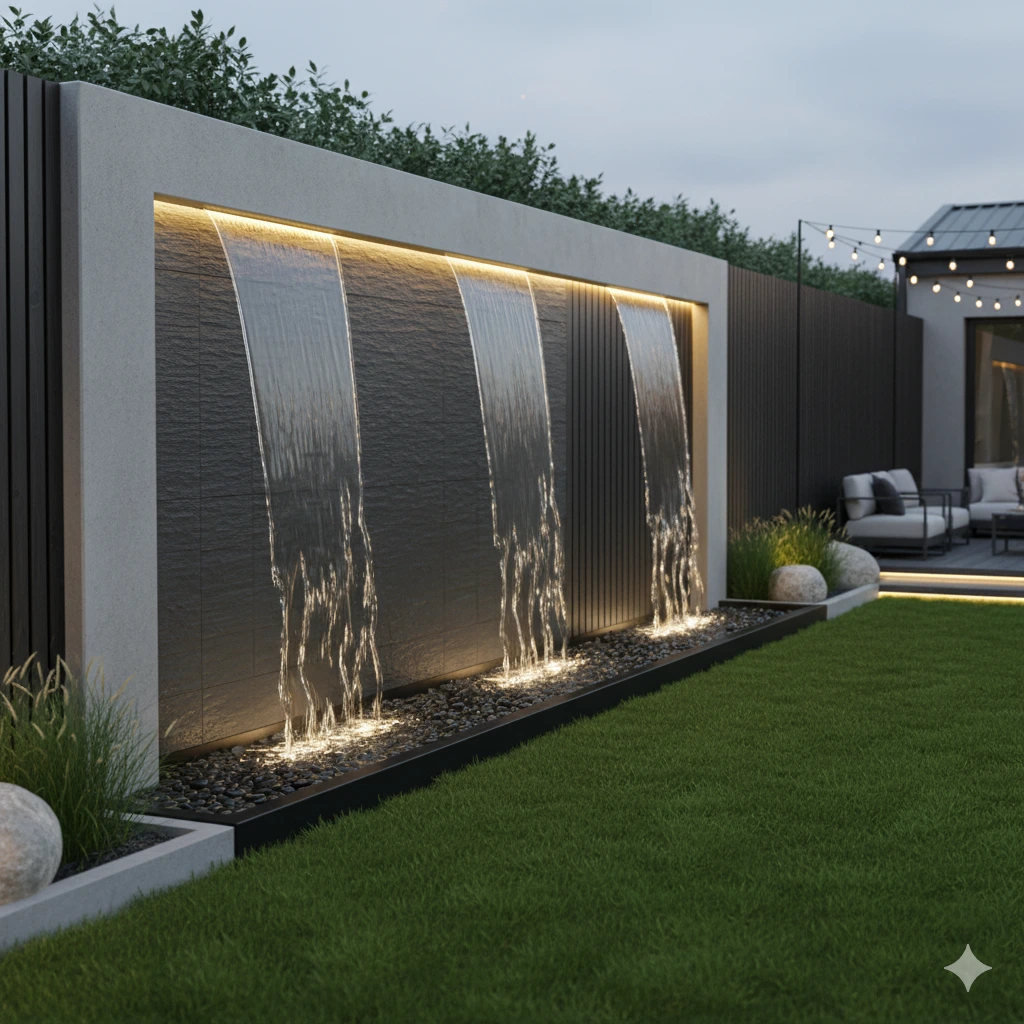 - Stone or slate panel waterfalls for timeless luxury