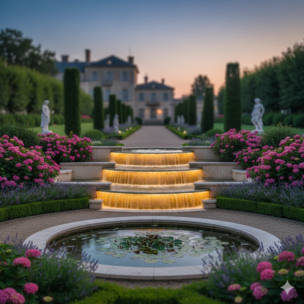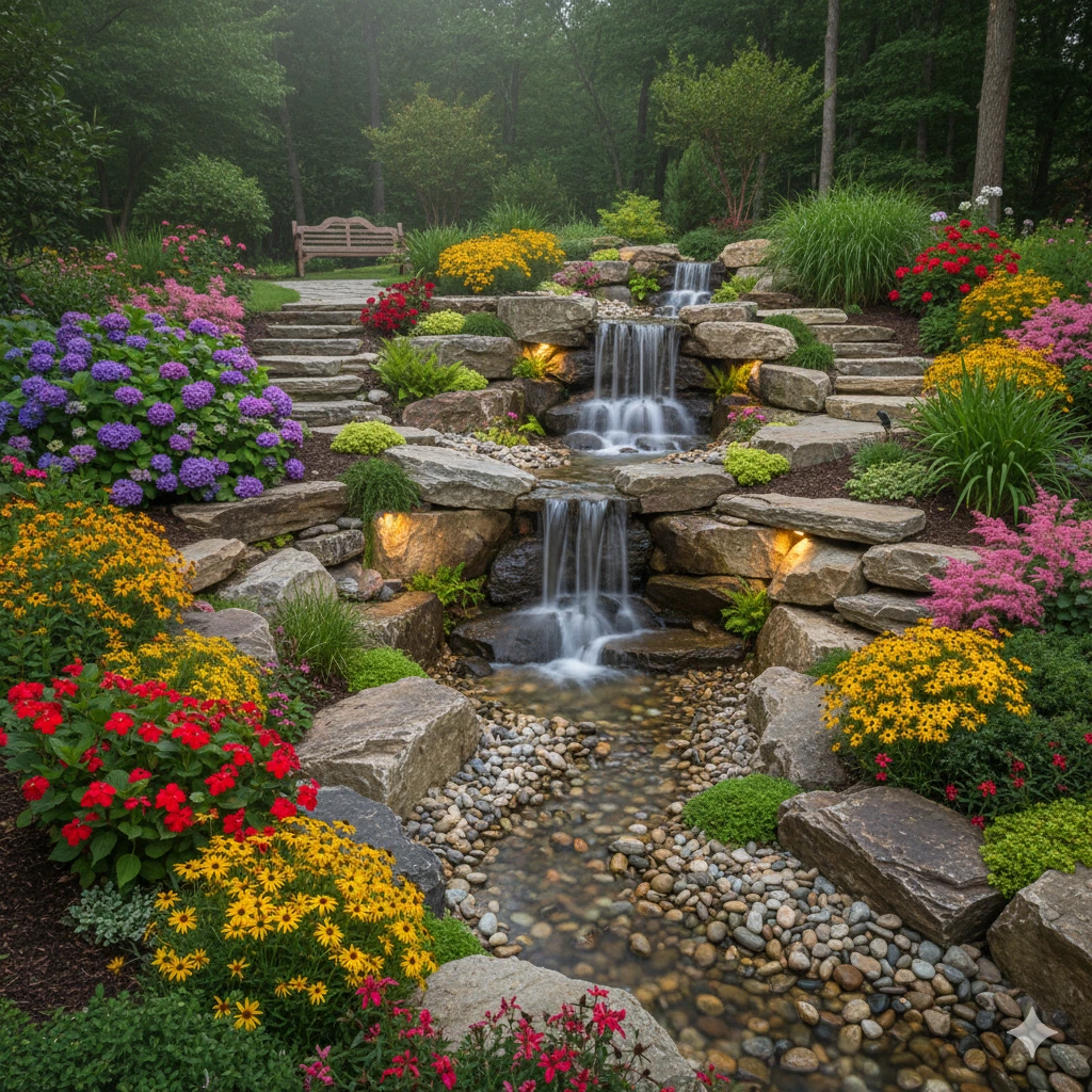 - Tiered stone waterfalls for elegant gardens